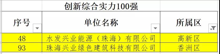 近日,珠海市科技創(chuàng )新局對2021年珠海市高新技術(shù)企業(yè)百強名單進(jìn)行公示,中國水發(fā)興業(yè)能源集團有限公司旗下權屬公司再度入榜:水發(fā)興業(yè)能源(珠海)有限公司入選經(jīng)濟貢獻100強(排名51)和創(chuàng )新綜合實(shí)力100強(排名48);珠海興業(yè)綠色建筑科技有限公司入選創(chuàng )新綜合實(shí)力100強(排名93)。